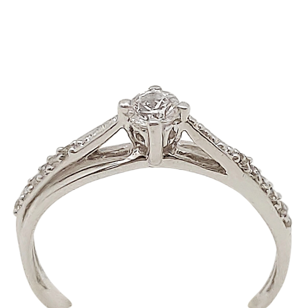 This special engagement ring is made of 14-karat white gold and decorated with tiny zirconia stones to make every detail sparkle. The ring's finely crafted, elegant design is both modern and romantic. At the center of the ring, a gorgeous zirconia stone sits in a princess-cut setting, and the subtle sparkle of the tiny zirconia stones set in the band adds a little extra sparkle, making the moment of your engagement even more special. This ring is the perfect choice if you are looking for something truly unique and memorable.