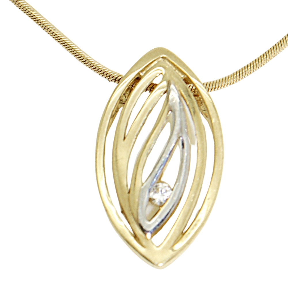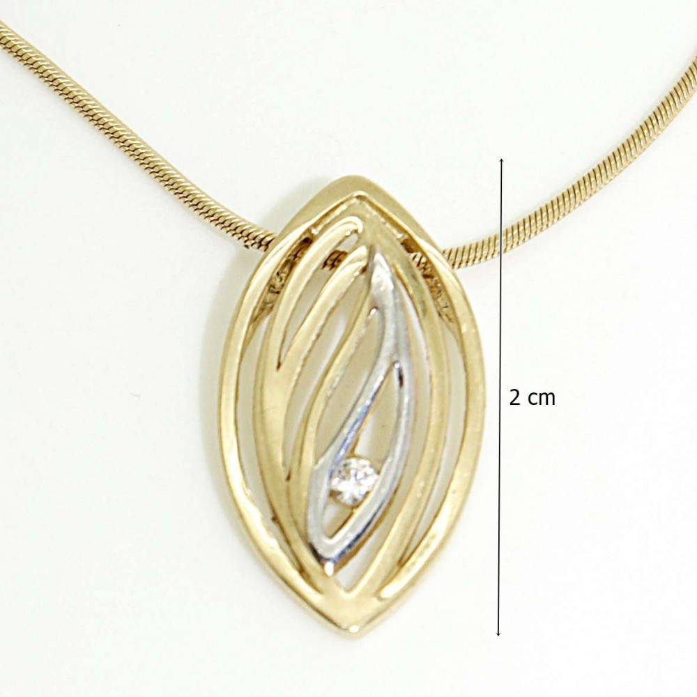 A beautiful 14-karat gold pendant with a leaf motif. The leaf is a symbol of the eternal cycle of life, its veins are represented by yellow and white gold threads, and in the center is a zirconia stone as the seed of life. The cycle of life gold pendant is an elegant and unique piece, suitable for any occasion.