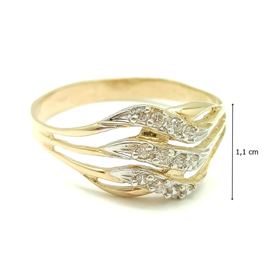 A unique gold ring with zirconia stones. The head of the ring is divided into three rows, each of which is made more sparkling with tiny zirconia stones. This is a great choice for those who love sparkling stone rings but are not looking for a solitaire type ring.