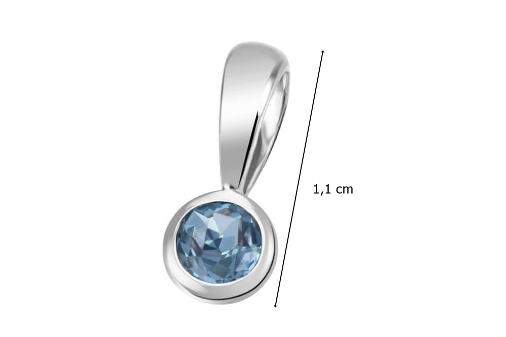 A beautiful 14-karat white gold pendant with a sparkling blue topaz set in a button setting. This white gold topaz pendant in a button setting shows off its beauty when worn on a white gold chain. You can wear it to a wedding, either as the bride or a guest, paired with a blue dress.