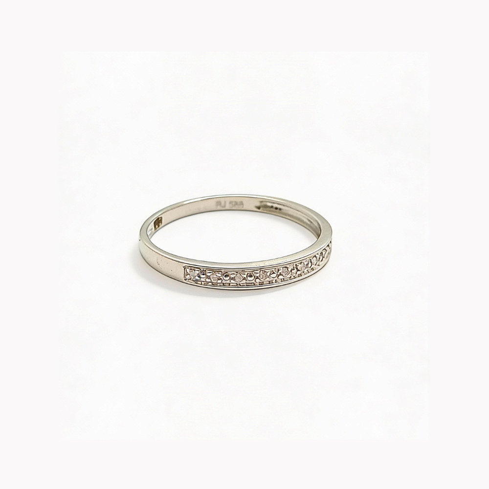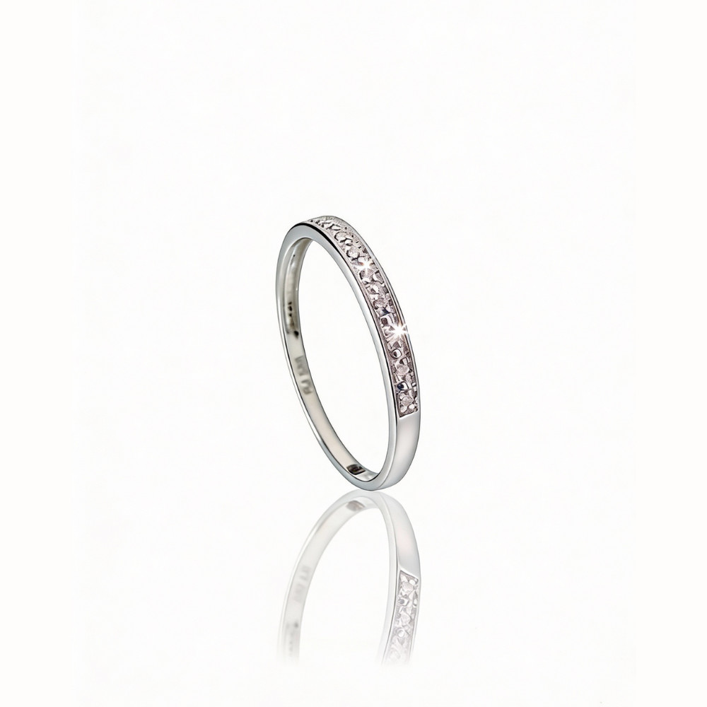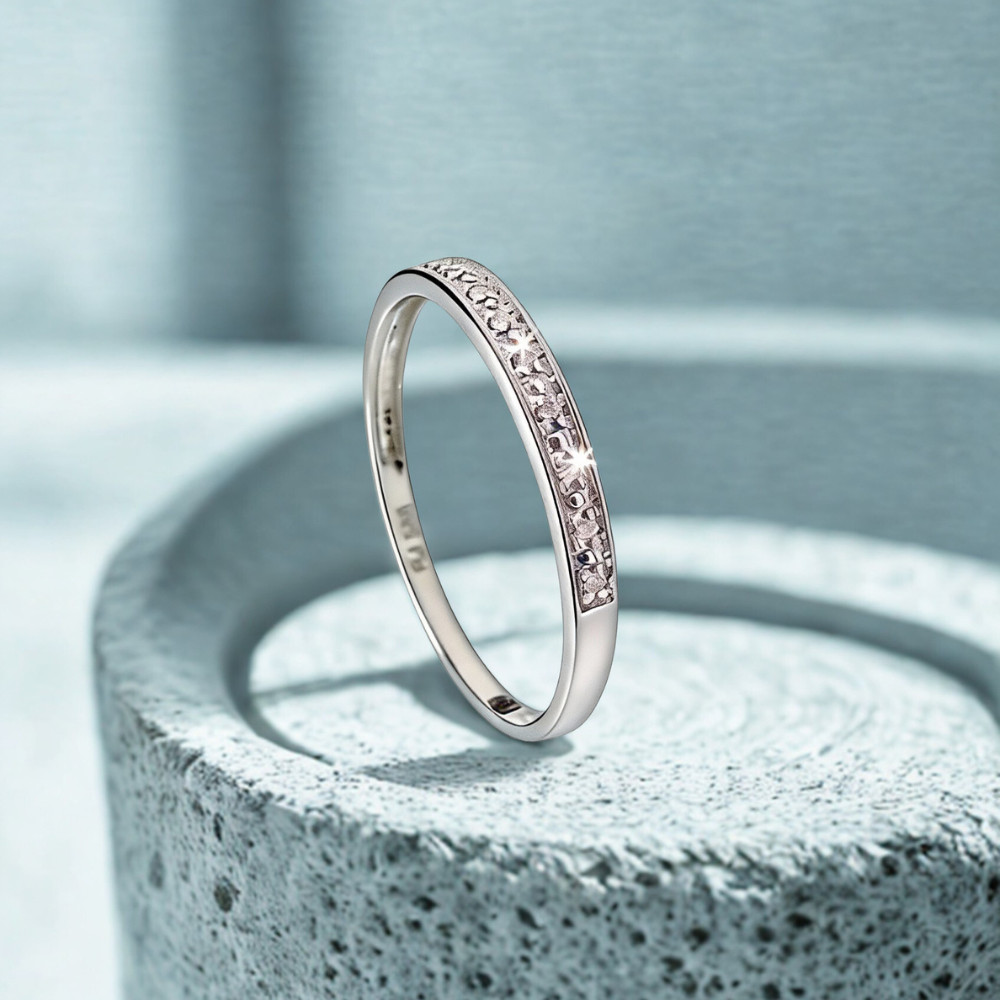 The dazzling white gold wedding band decorated with 11 diamonds in a row, totaling 0.03 ct. The ring has clean lines, and the sparkling diamond stones make this piece of jewelry truly special. Find the yellow gold version here »